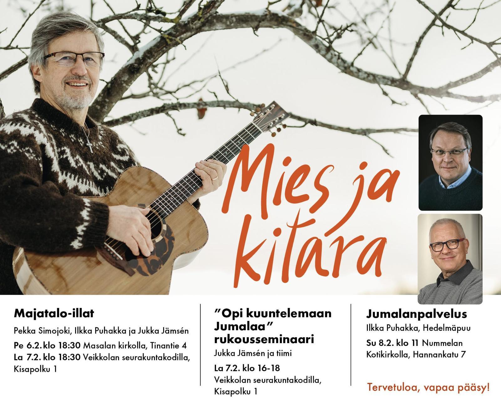 Pekka Simojoki, Jukka Jämsen ja Ilkka Puhakka vierailevat Veikkolassa lauantaina 7.2.2026. Ohjelmassa rukousseminaari, jossa kuunnellaan Jumalaa sekä majataloilta, jossa kuullaan Pekka Simojoen lauluja ja tarinoita. Laita päivä kalenteriin!
